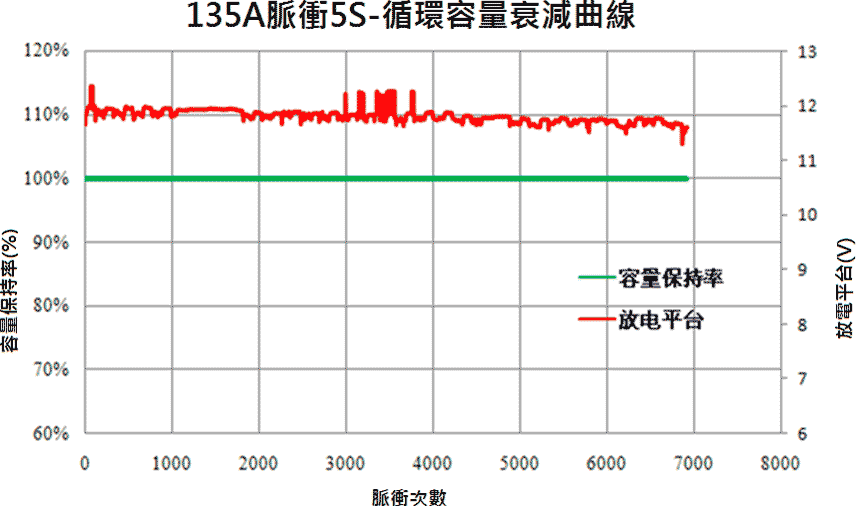 - 循環6900次後容量無衰減,放電平台仍在11.5V以上。